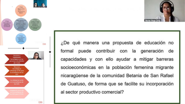 El primer trabajo, titulado “Voces de la migración: Barreras socioeconómicas que enfrentan la población femenina migrante nicaragüense de la comunidad de Betania de San Rafael de Guatuso para integrarse activamente al sector productivo costarricense”, presentado por Judith Martínez Flores y Nerey Vega Ortiz, desarrolló una propuesta educativa no formal orientada a integrar mujeres migrantes al sector productivo local, con un enfoque participativo que visibiliza poblaciones históricamente excluidas y responde a los principios de inclusión y justicia social promovidos por la DER.